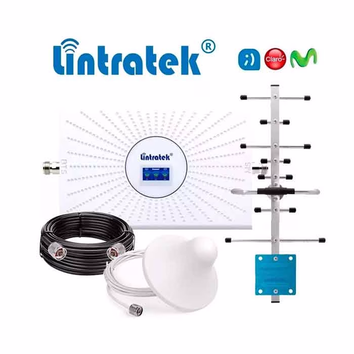 KIT AMPLIFICADOR CELULAR LINTRATEK AA23-CPA 3 BANDAS 850/1900/2100MHz 2G/3G/4G 70dB ANTENA OUT. YAGI 8dBi CABLE 10m + ANTENA IND. DOMO 5dBi AGC