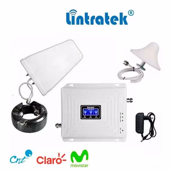 KIT AMPLIFICADOR CELULAR LINTRATEK KW20C-CPA 3 BANDAS 850/1900/2100MHz 3G/4G 65dB + ANT OUT. LPDA 10dBI 10m + ANT IND. DOMO 5dBi 3m