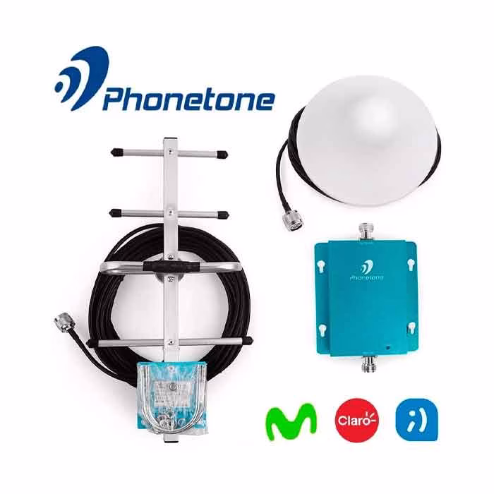 KIT AMPLIFICADOR SEÑAL CELULAR PHONETONE C980D-AYB-D BANDA 850MHz 3G 60dB + ANTENA OUT. YAGI 8dBi CABLE 10m + ANTENA IND. DOMO OMNI 5dBi